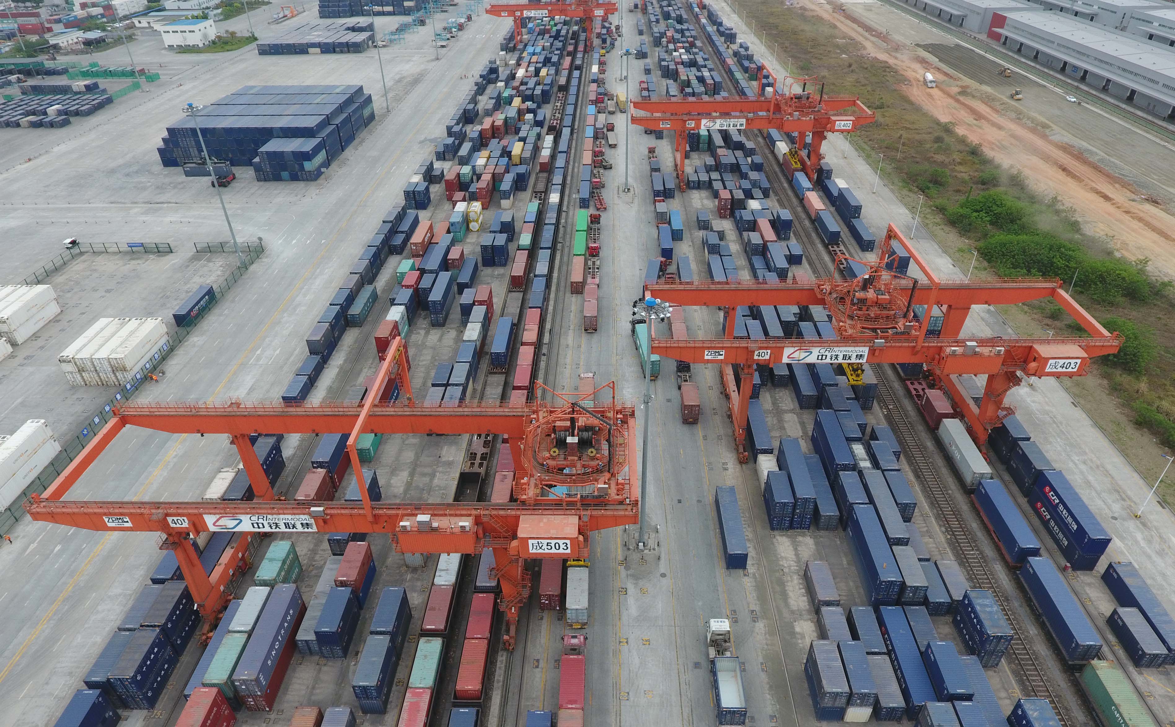 Photo taken on April 20, 2017 shows the containers in a railway container center in Qingbaijiang District in Chengdu, capital of southwest China's Sichuan Province. (Xinhua/Xue Yubin)