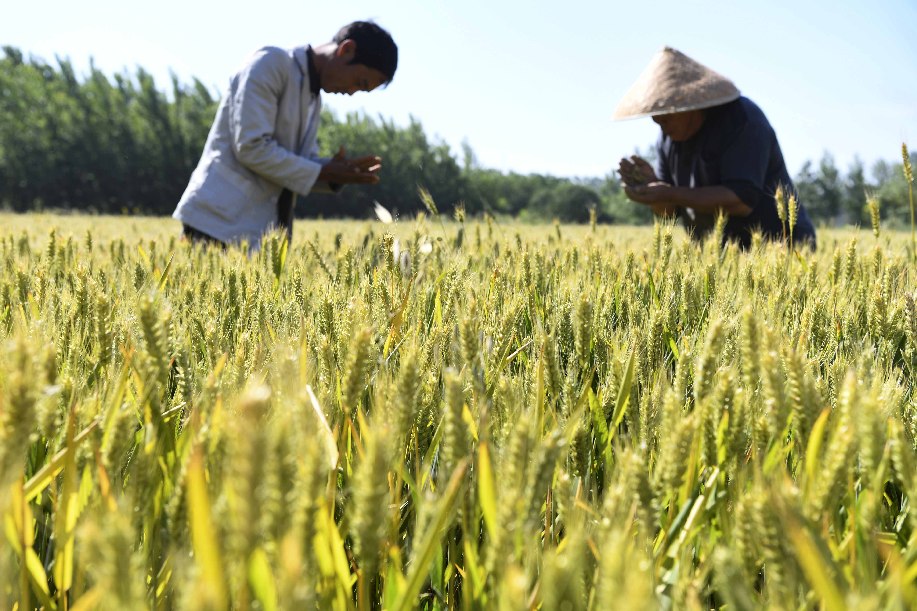 Farmers checks the growth of wheat in a field in Shibali Township of Qiaocheng District in Bozhou, east China's Anhui Province, May 21, 2019. (Xinhua)