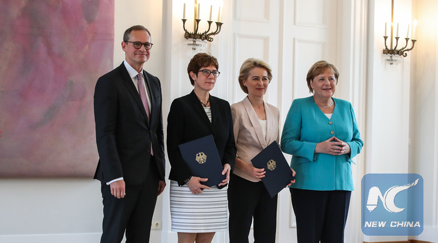 (From R to L) German Chancellor Angela Merkel, outgoing German Defense Minister Ursula von der Leyen, incoming German Defense Minister Annegret Kramp-Karrenbauer, and Michael Mueller, deputy president of the Bundesrat and Berlin's head of government, pose for a group photo after a ceremony for the appointment of German Defense Minister at the Bellevue Palace in Berlin, capital of Germany, July 17, 2019. (Xinhua/Shan Yuqi)