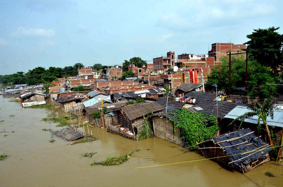 The file photo taken on July 17, 2019 shows flooded residences in Muzaffarpur district, Bihar, India. Many residents have been left homeless by recent flood caused by incessant rain in India's eastern state of Bihar. (Xinhua/Stringer)