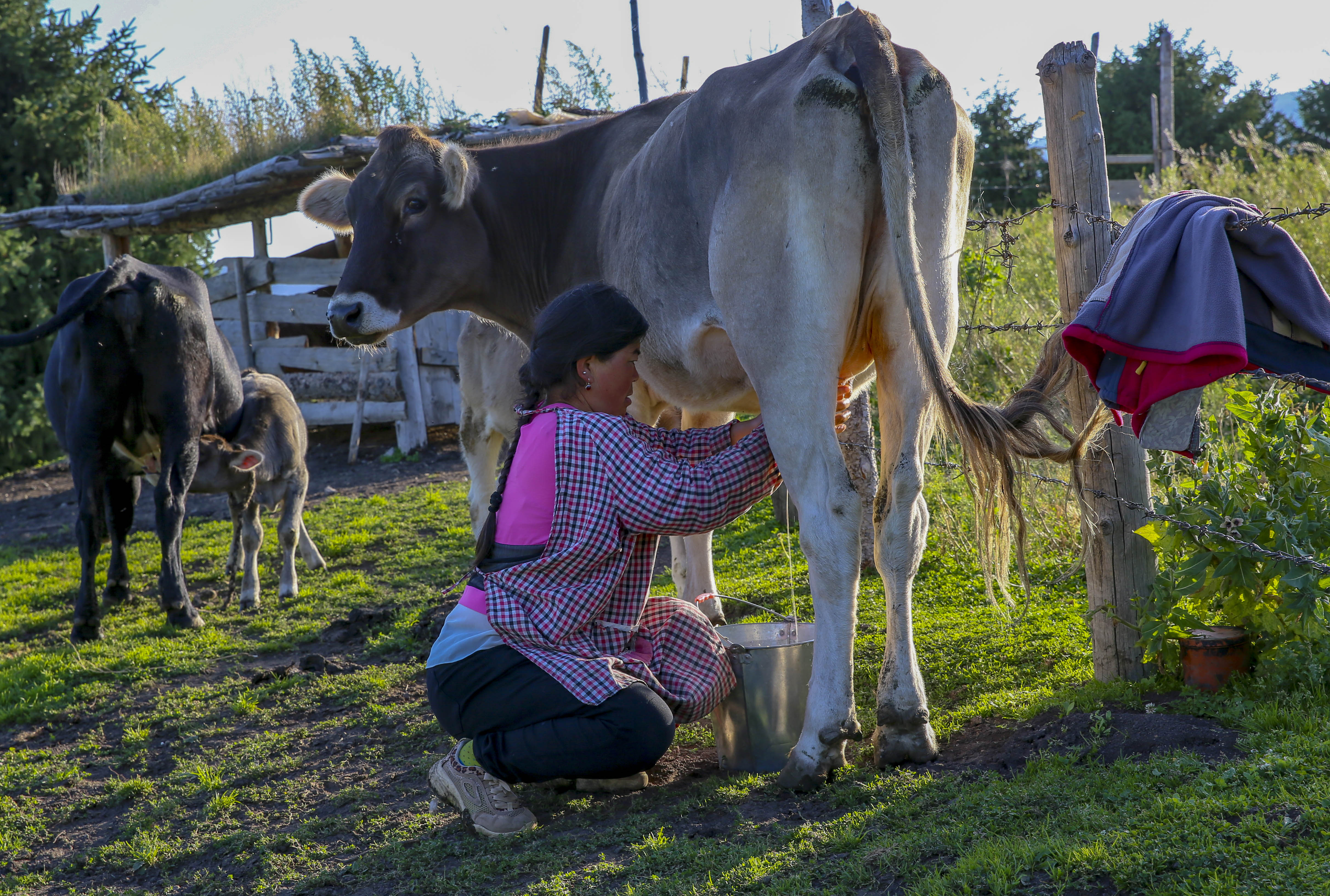 A villager milks a cow at Qiongkushitai Village in Karadala Township in Tekes County, NW China's Xinjiang Uygur Autonomous Region. (Xinhua/Li Peng)