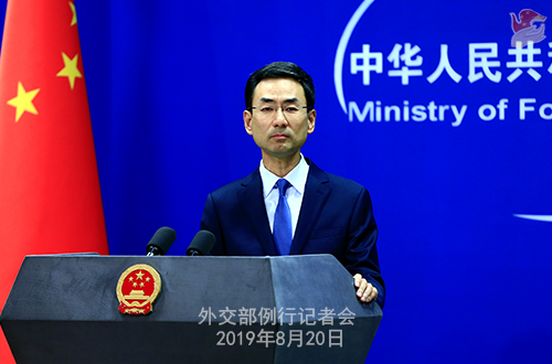 Chinese Foreign Ministry spokesman Geng Shuang answers questions at a press briefing in Beijing on Aug. 20, 2019.