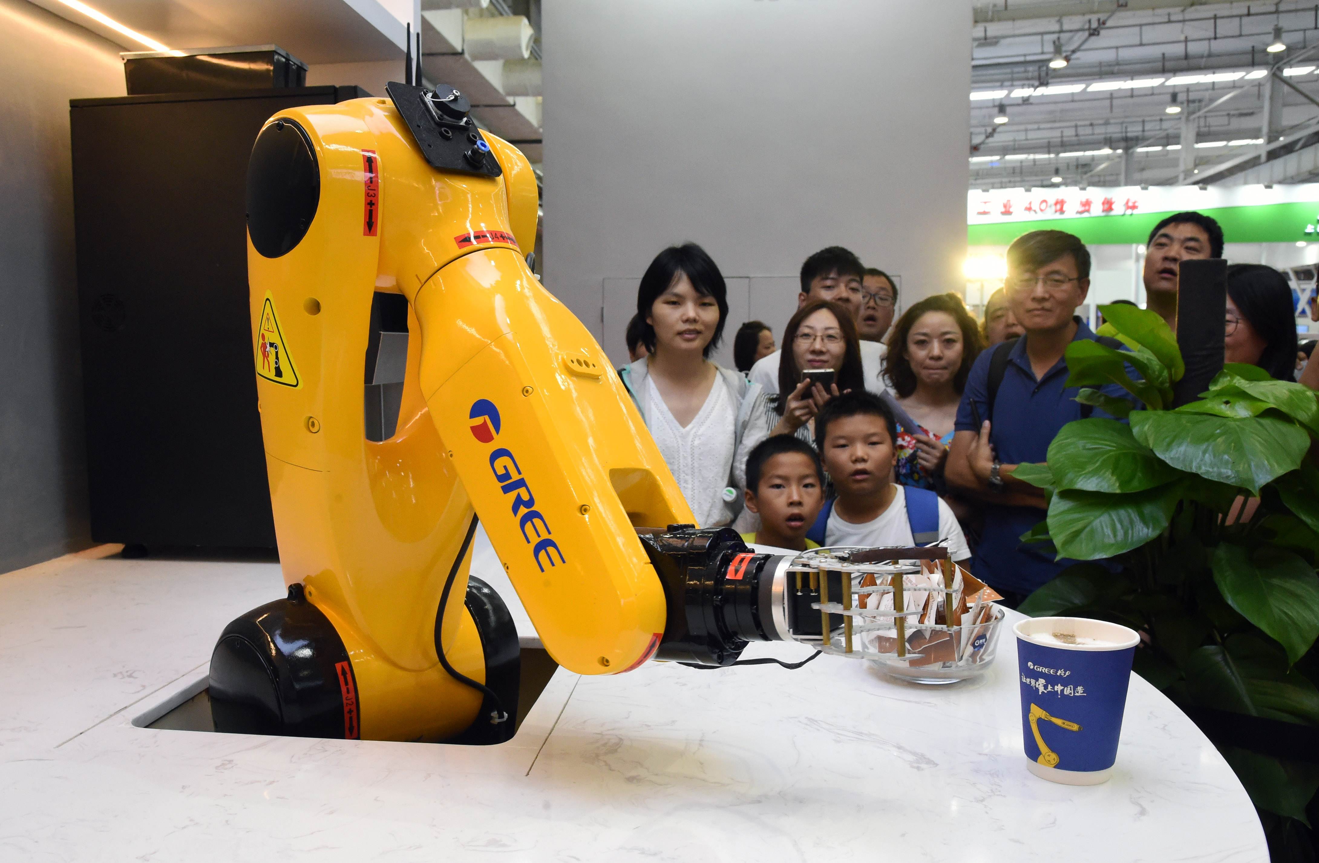 Photo taken on Aug. 23, 2019 shows a robot barista, developed by Chinese home appliance producer Gree Electric Appliances, exhibited at the 2019 World Robot Conference (WRC) in Beijing, capital of China. (Xinhua/Ren Chao)