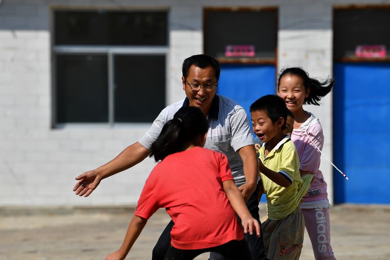 Rural teacher Wang Fuping and his students play a game at Yangjiawa primary school in Yangjiawa village of Gaojiagou township of Liulin county, Lyuliang, north China's Shanxi Province. (Xinhua/Zhan Yan)