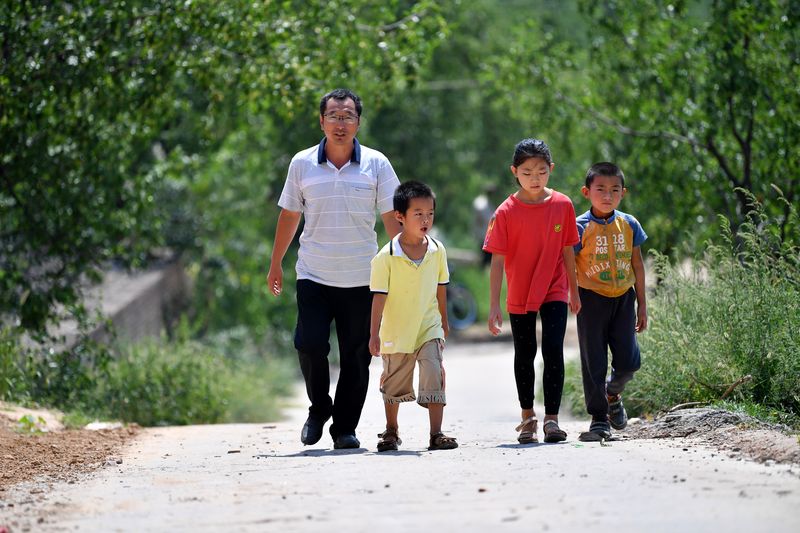 Rural teacher Wang Fuping accompanies his students to go back home after class at noon in Yangjiawa village of Gaojiagou township of Liulin county, Lyuliang, north China's Shanxi Province. (Xinhua/Zhan Yan)