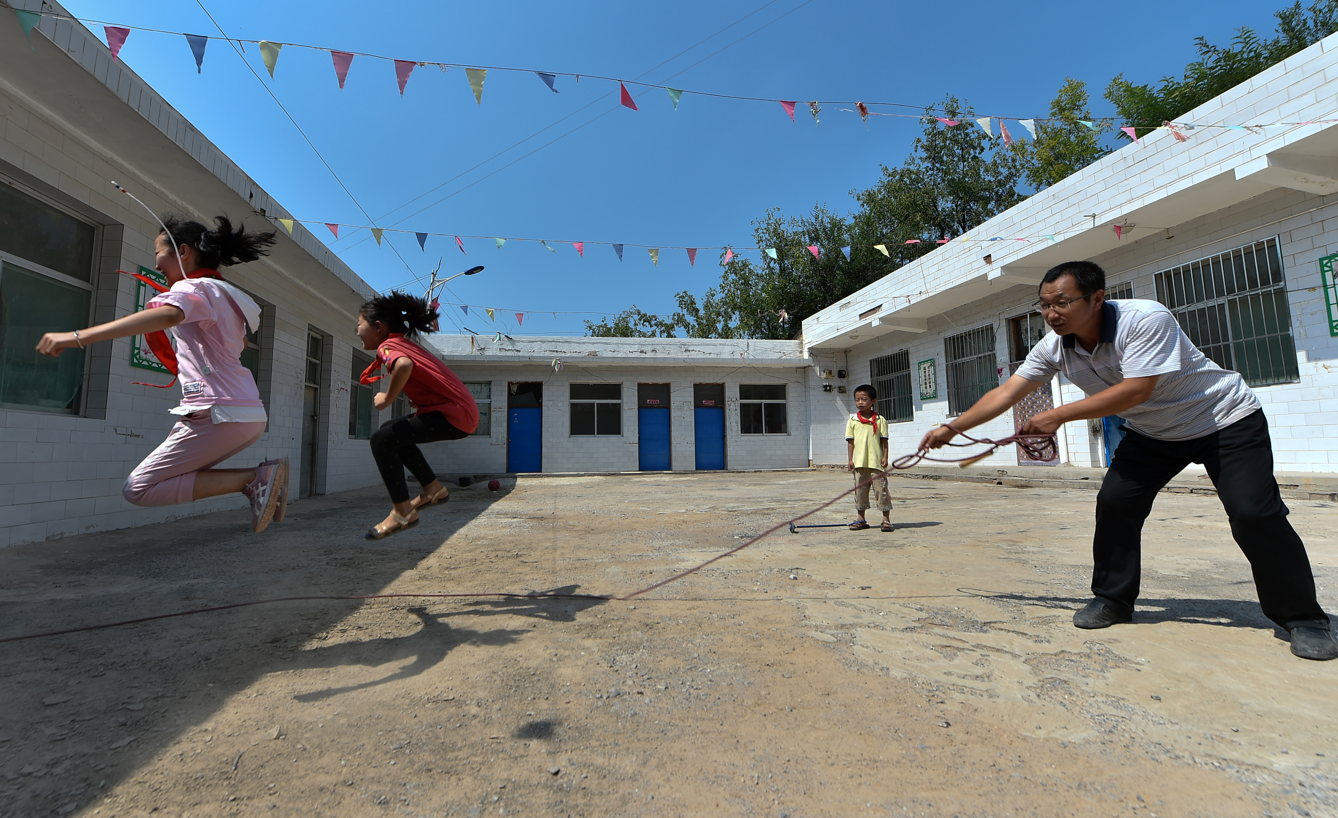 Rural teacher Wang Fuping and his students play rope-skipping at sport class at Yangjiawa primary school in Yangjiawa village of Gaojiagou township of Liulin county, Lyuliang, north China's Shanxi Province. (Xinhua/Zhan Yan)