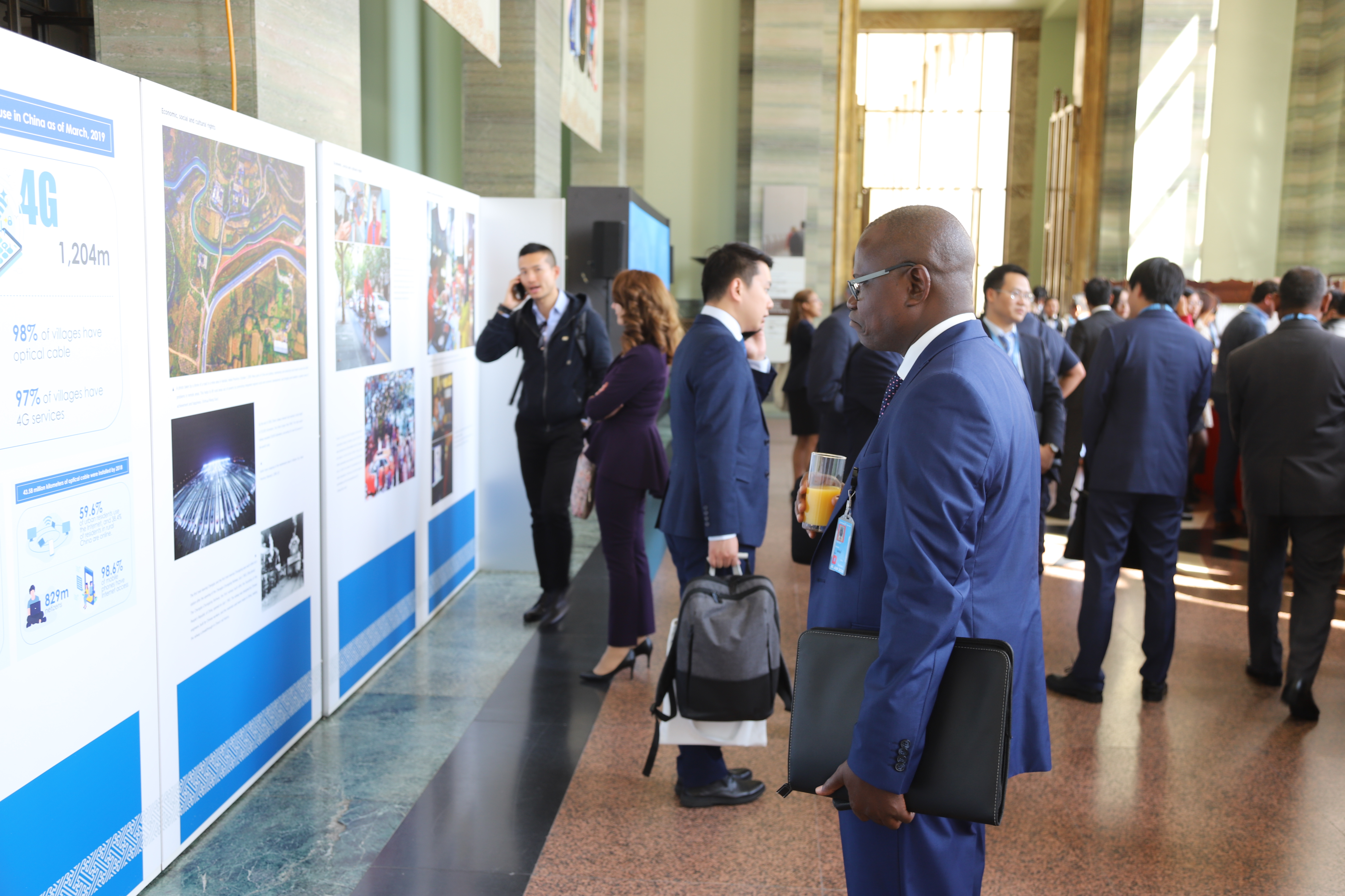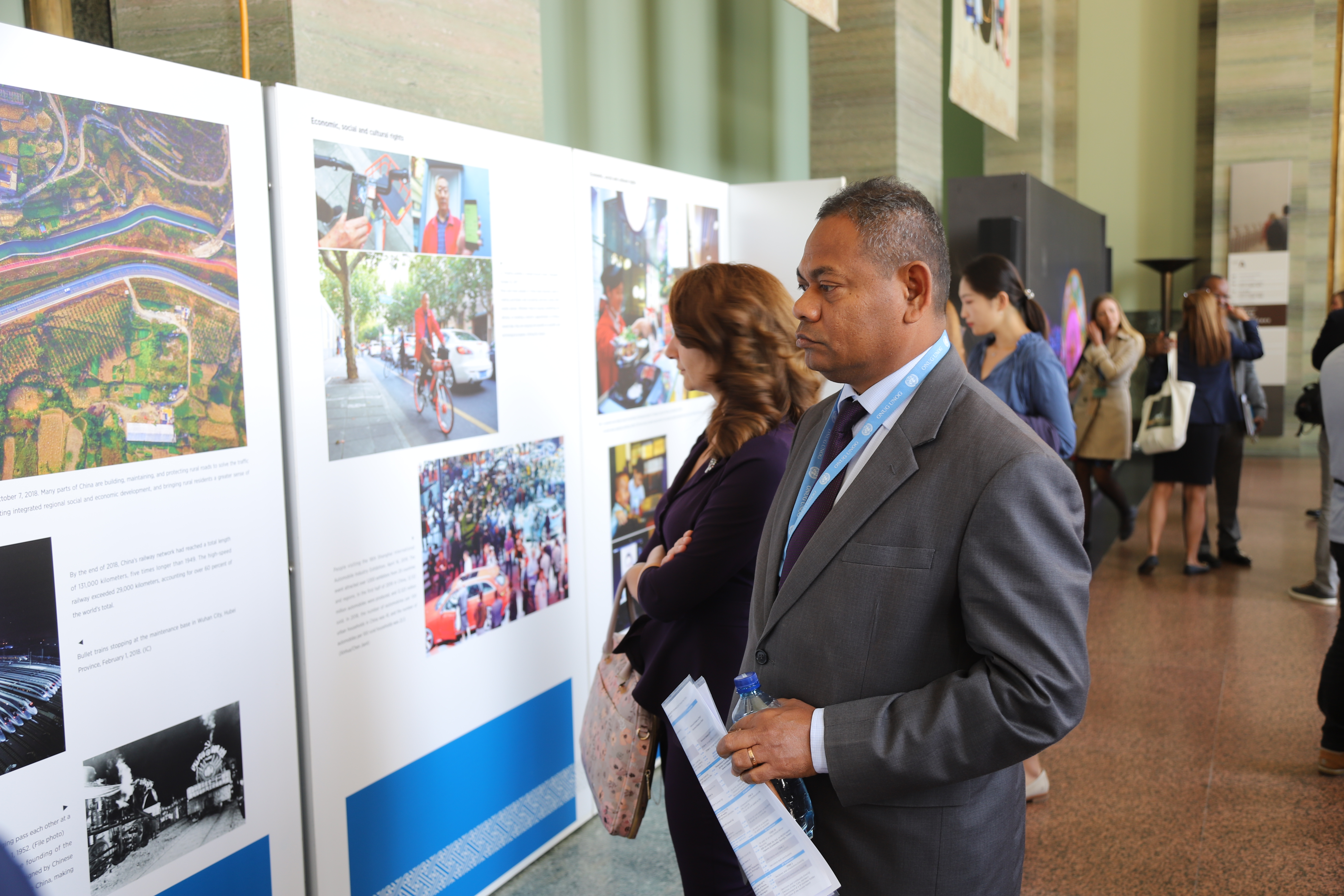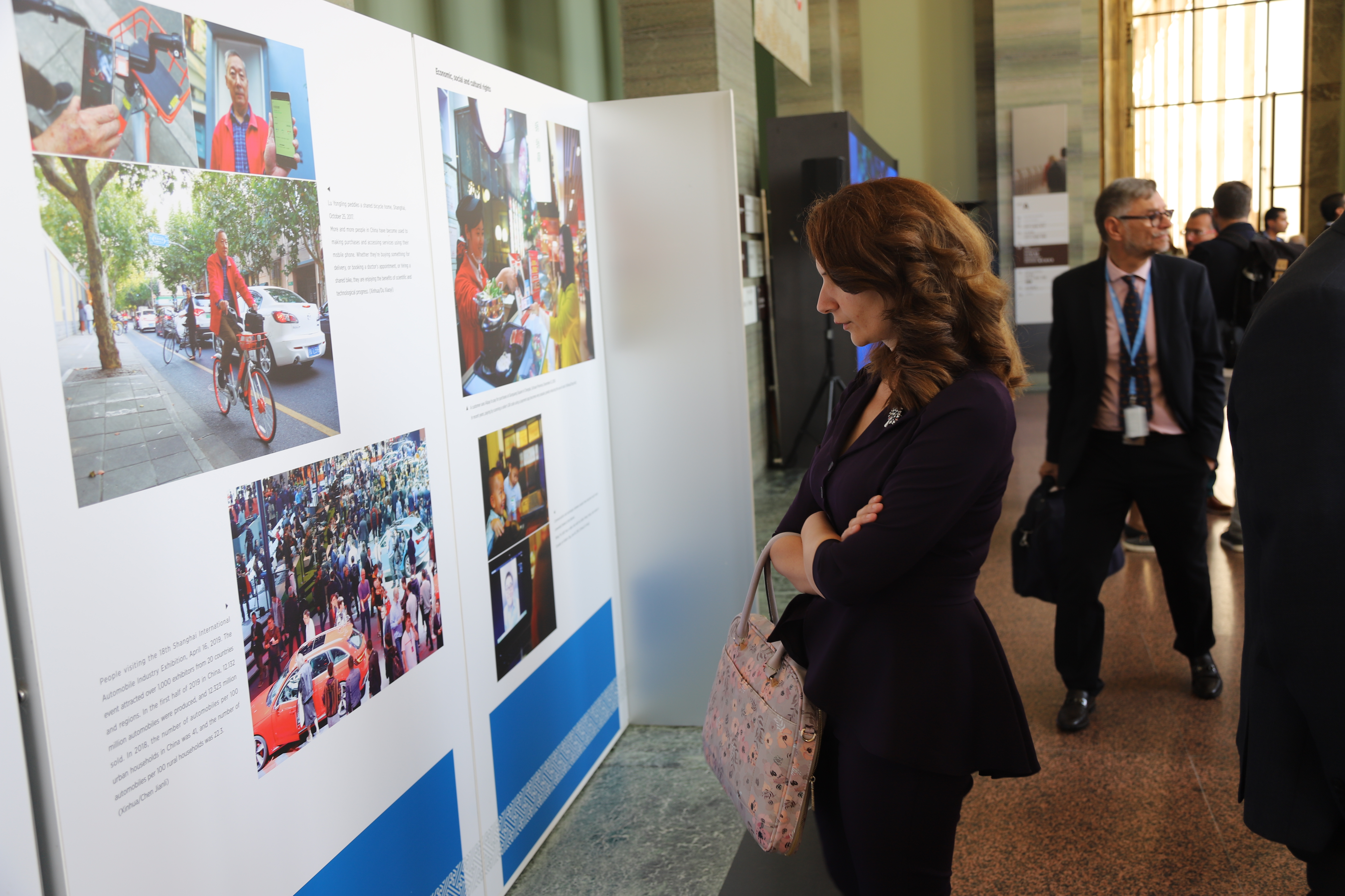People visit an exhibition "Pursuing Happiness for the People: 70 Years of Human Rights Progress in China" at the Palais des Nations in Geneva, Switzerland, Sept. 9, 2019. (Xinhua/Chen Junxia)