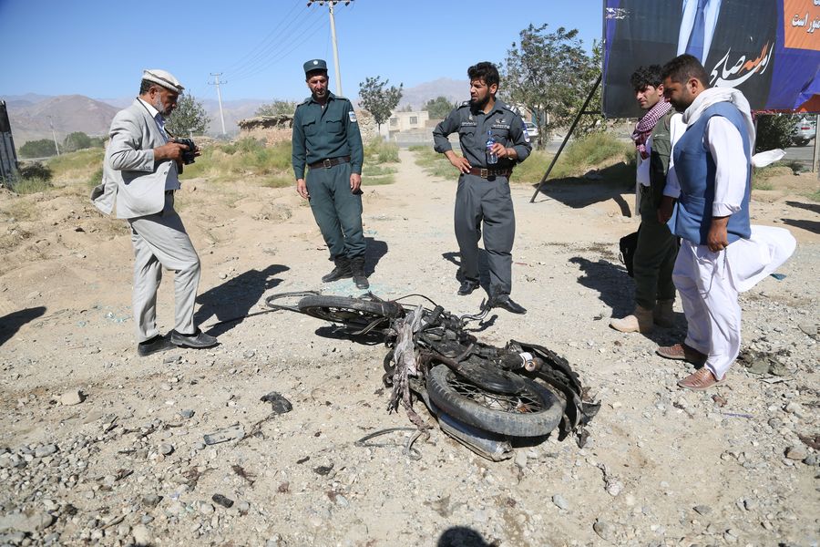 Afghan security force members inspect the site of an attack in Charikar, capital of Parwan province, Afghanistan, Sept. 17, 2019. (Photo by Rohullah/Xinhua)