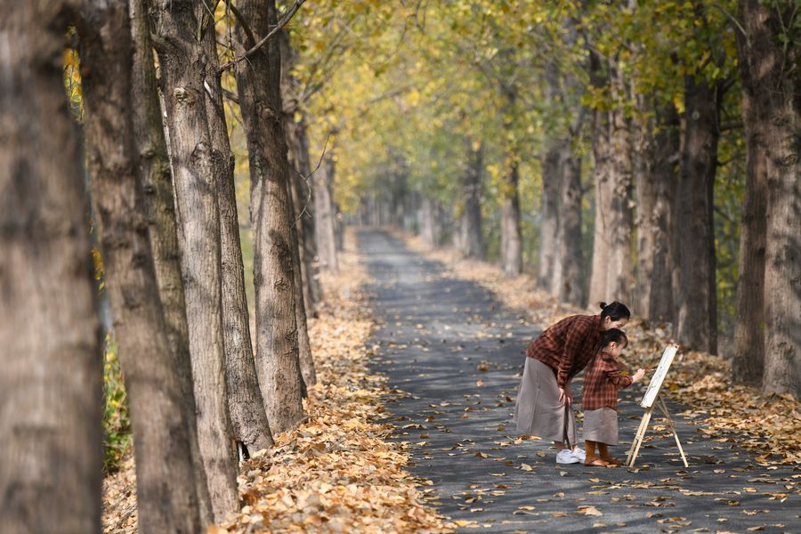 Tourists draws a picture on a road covered with fallen leaves in Sanshigang Town of Hefei, capital of east China's Anhui Province, Nov. 3, 2019. (Xinhua/Zhang Duan)
