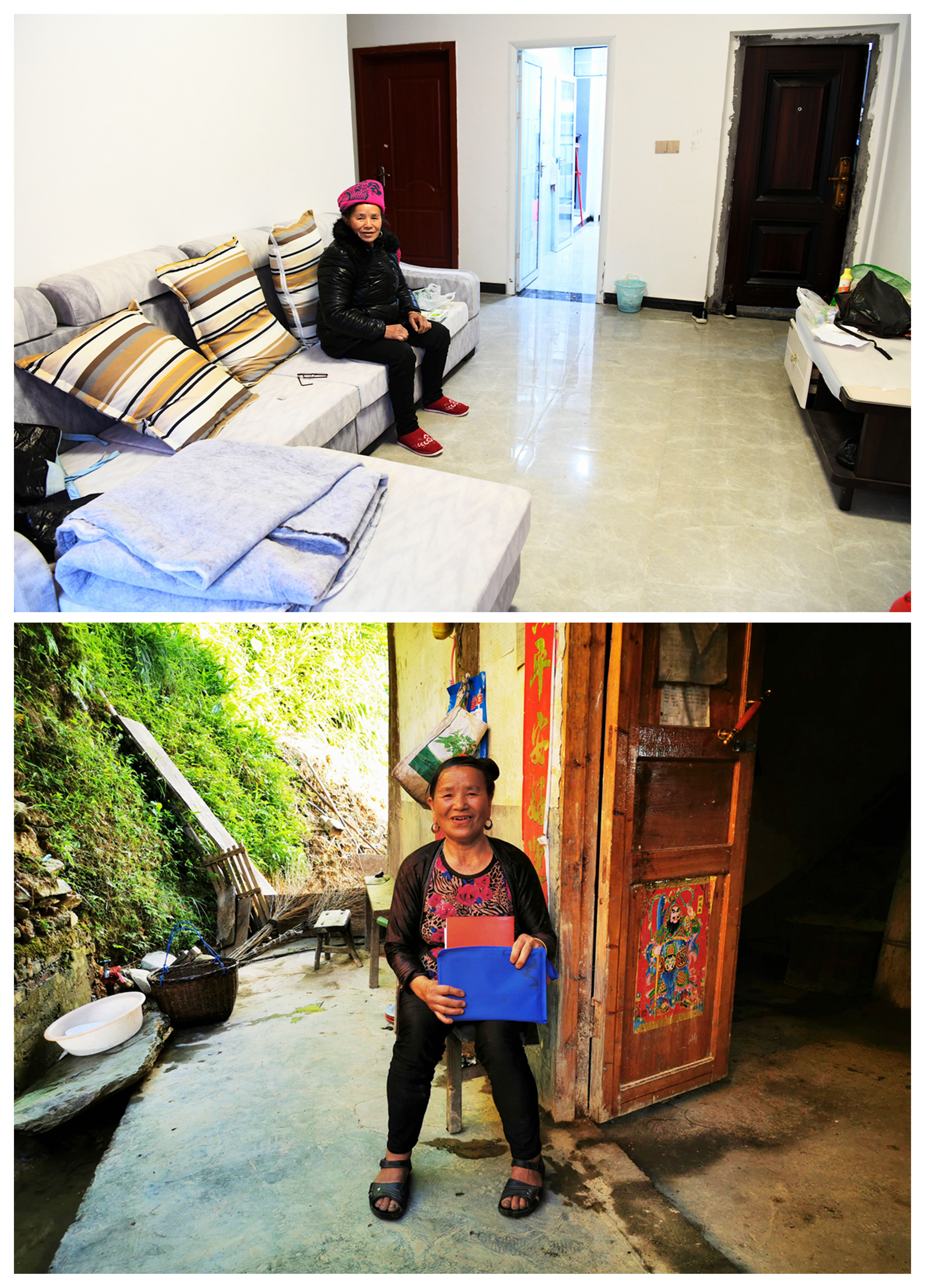 Combo photo taken on Dec. 21, 2019 by Yang Wenbin shows a woman sitting in her new house at a relocation area (up) and photo taken on July 24, 2019 by Wu Dejun shows the woman sitting in front of her former house (down) in Congjiang County, southwest China's Guizhou Province. (Xinhua)