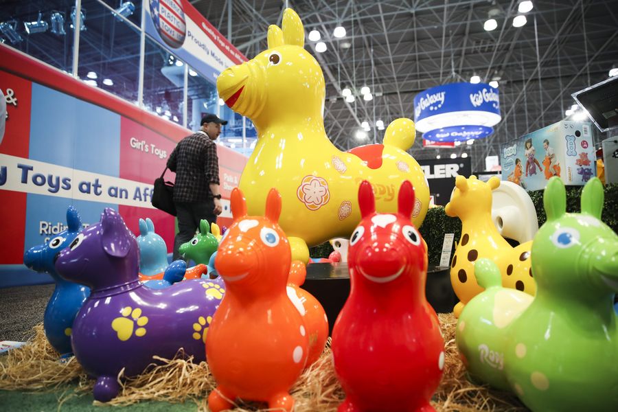 Colorful child's riding toys are displayed at the 116th Annual North American International Toy Fair at the Jacob K. Javits Convention Center in New York, the United States, Feb. 16, 2019. (Xinhua/Wang Ying)
