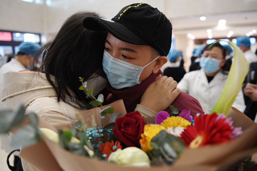 A medical team member (R) of Gansu Provincial Maternity and Child-care Hospital hugs a colleague before leaving for Wuhan in Lanzhou, northwest China's Gansu Province, Feb. 15, 2020. (Xinhua/Chen Bin)