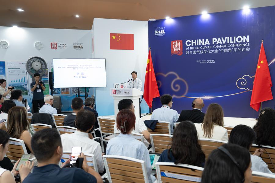 The China Pavilion, a platform to showcase the country's achievements on climate governance, has drawn global attention at COP30. Li Gao, head of the Chinese delegation and vice minister of ecology and environment, briefed the audience during a side event at the pavilion on China's experience in developing its national carbon market.