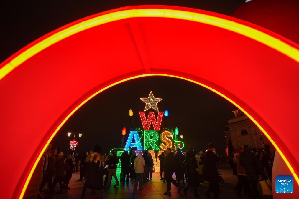 Visitors are seen next to a holiday light installation in the Old Town in Warsaw, Poland, Dec. 3, 2025. Christmas decorations bring strong festive vibe to the city. (Photo by Jaap Arriens/Xinhua)
