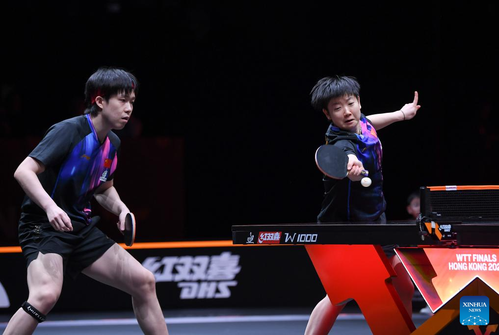 Wang Chuqin (L)/Sun Yingsha compete during the mixed doubles group 1 match between Wang Chuqin/Sun Yingsha of China and Manush Shah/Diya Chitale of India at the WTT Finals Hong Kong 2025 in Hong Kong, south China, Dec. 10, 2025. (Xinhua/Zhu Wei)