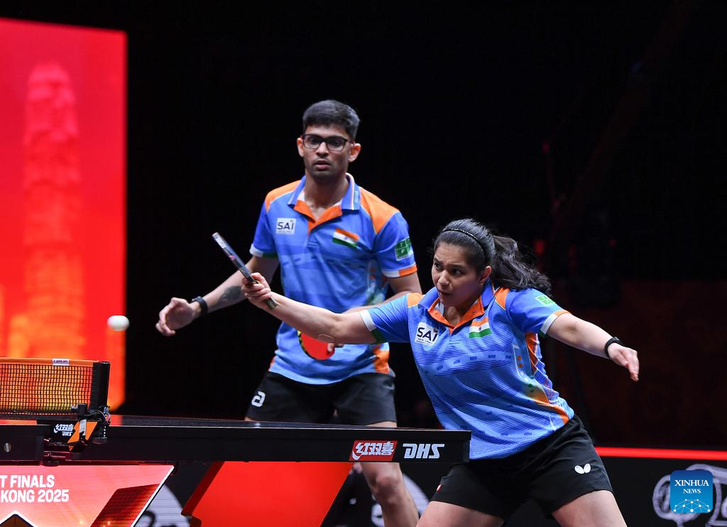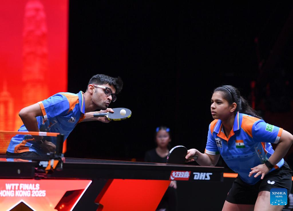 Manush Shah (L)/Diya Chitale compete during the mixed doubles group 1 match between Wang Chuqin/Sun Yingsha of China and Manush Shah/Diya Chitale of India at the WTT Finals Hong Kong 2025 in Hong Kong, south China, Dec. 10, 2025. (Xinhua/Chen Duo)