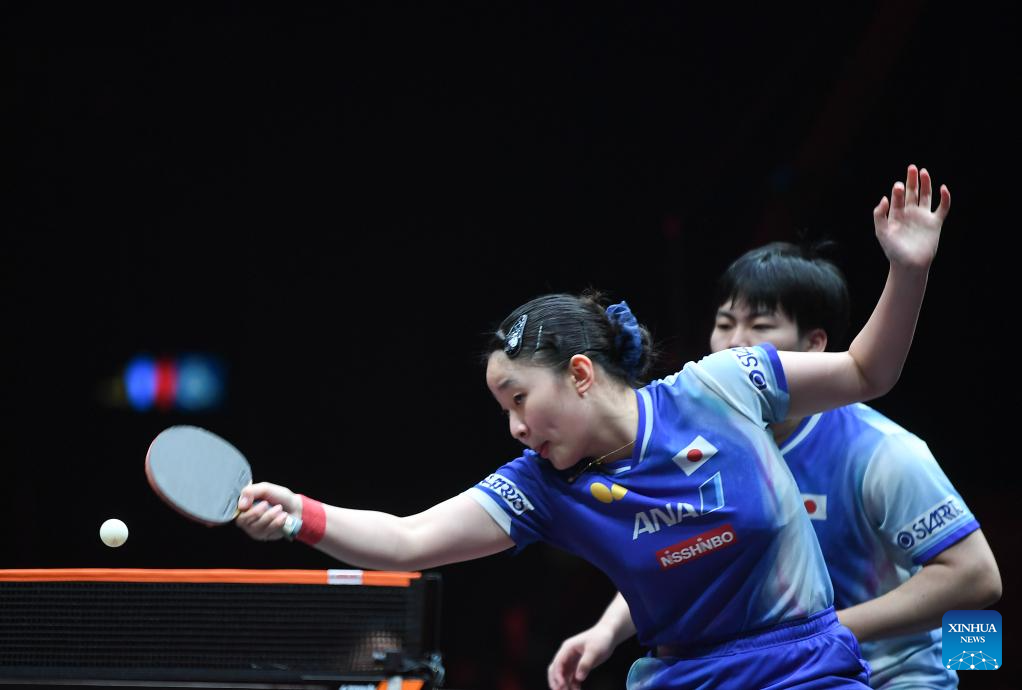 Matsushima Sora (L)/Harimoto Miwa of Japan compete during the mixed doubles group 2 match between Alvaro Robles/Maria Xiao of Spain and Matsushima Sora/Harimoto Miwa of Japan of the WTT Finals Hong Kong 2025 in Hong Kong, south China, Dec. 10, 2025. (Xinhua/Chen Duo)