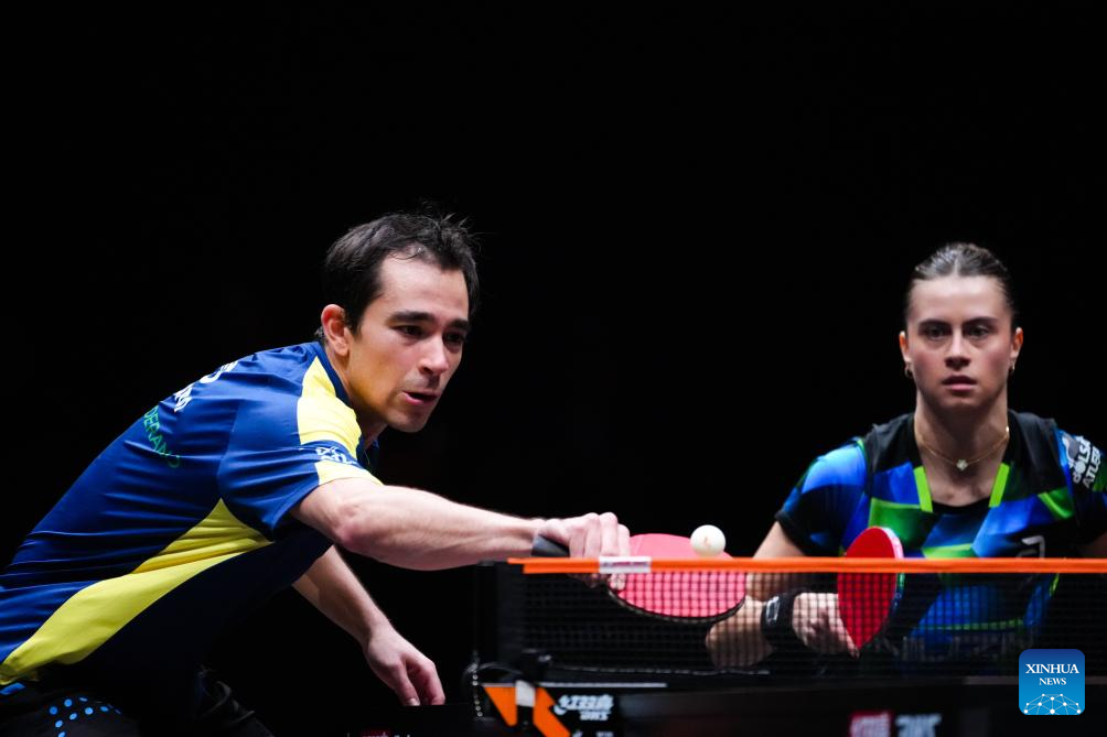 Hugo Calderano (R)/Bruna Takahashi of Brazil compete during the mixed doubles group 2 match between Lim Jonghoon/Shin Yubin of South Korea and Hugo Calderano/Bruna Takahashi of Brazil of the WTT Finals Hong Kong 2025 in Hong Kong, south China, Dec. 10, 2025. (Xinhua/Zhu Wei)