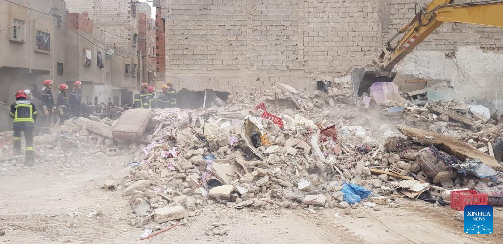Rescuers work at the site where two buildings collapsed in the city of Fes in Morocco, Dec. 10, 2025. At least 19 people were killed and 16 others injured when two buildings collapsed in the city of Fes in Morocco Tuesday night, the country's state news agency said. (Photo by Saouri Aissa/Xinhua)