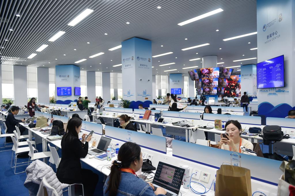 11月5日,媒体记者在第八届进博会新闻中心内工作。