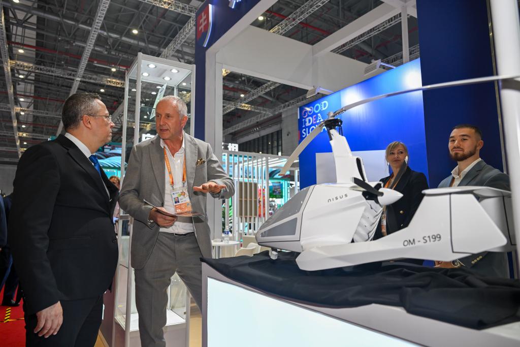 11月5日,在第八届进博会国家展斯洛伐克馆,参展商(左二)在向嘉宾(左一)介绍一款飞机产品。