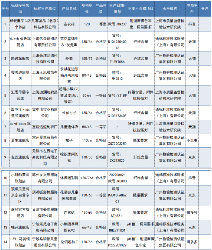 2022年网售儿童及婴幼儿服装质量国家监督抽查不合格产品及企业名单
