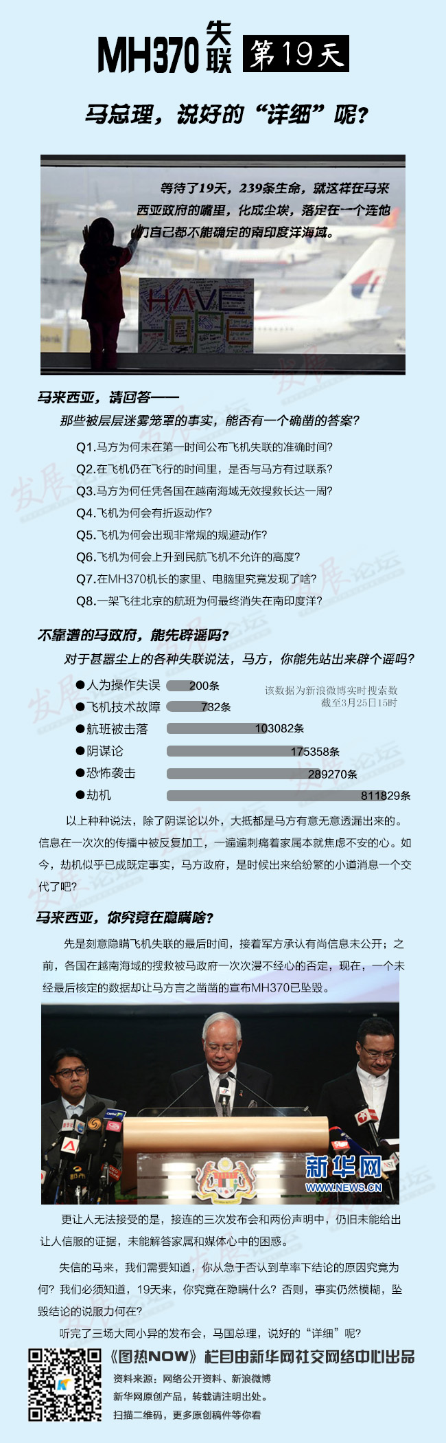 等待了19天,239條生命,就這樣在馬來西亞政府的嘴里,化成塵埃,落定在一個(gè)連他們自己都不能確定的南印度洋海域。事實(shí)仍然模糊,結(jié)論的說服力何在?馬國(guó)總理,你說好的“詳細(xì)”呢?