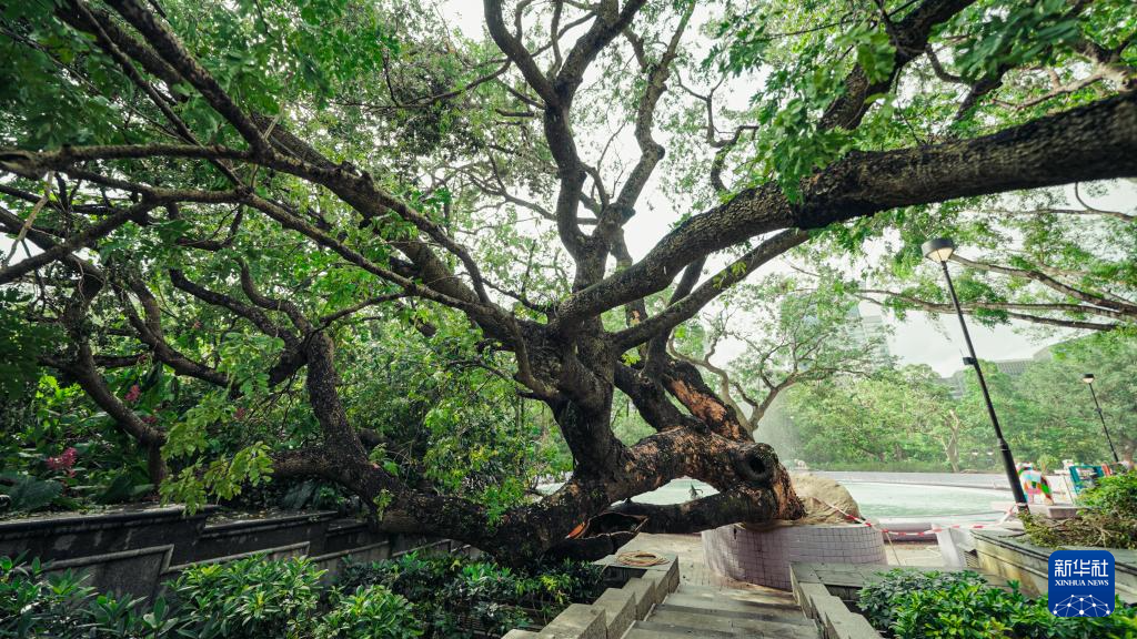 这是9月29日在香港九龙公园拍摄的被超强台风“桦加沙”刮倒的大叶合欢古树。新华社发