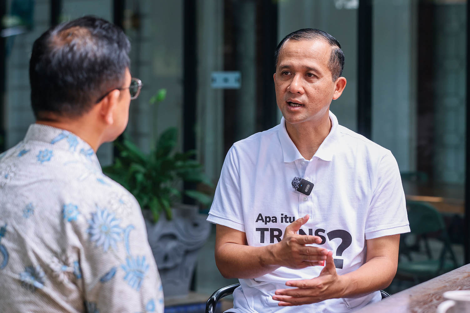 2025年11月16日,印度尼西亚人口流动部部长穆罕默德·伊夫提塔赫·苏莱曼(右)在雅加达接受新华社记者专访