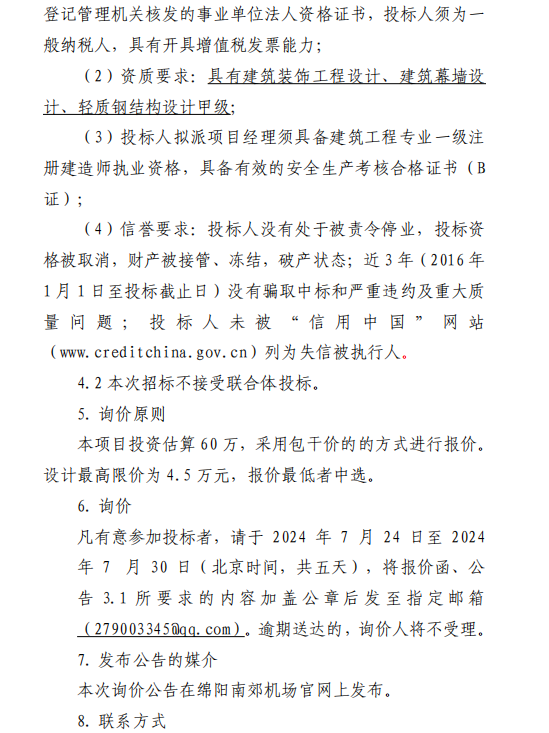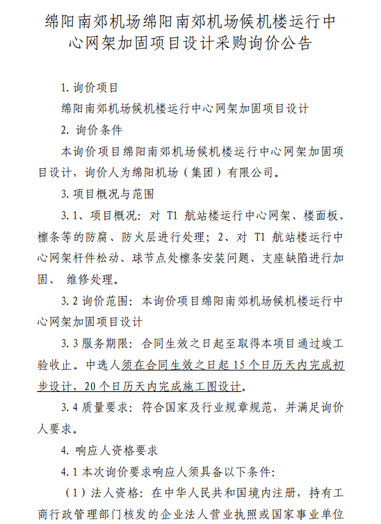 綿陽南郊機(jī)場綿陽南郊機(jī)場候機(jī)樓運(yùn)行中心網(wǎng)架加固項目設(shè)計采購詢價公告