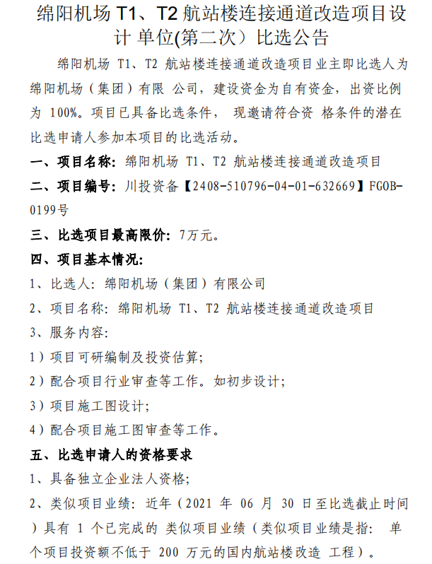 綿陽機場 T1、T2 航站樓連接通道改造項目設(shè)計單位(第二次)比選公告