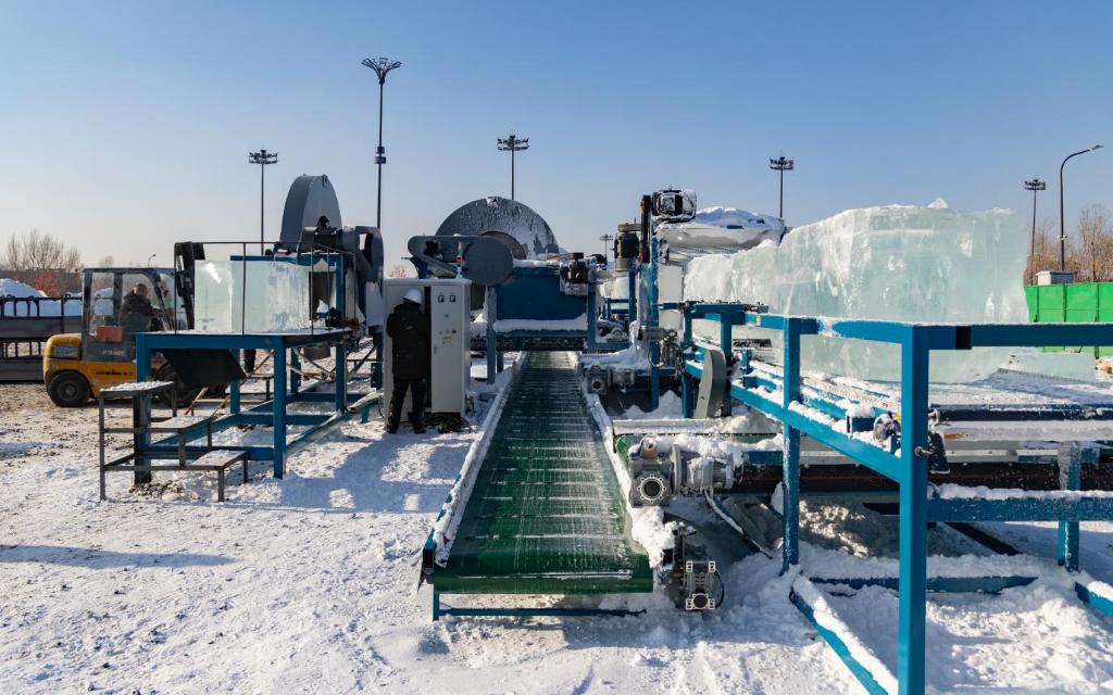 这两台“型冰机”是哈尔滨冰雪大世界与哈尔滨工业大学产学研深度合作的最新成果。它们正开足马力,将厚重的毛冰快速、精确地切割成平整光滑、尺寸统一的标准冰砌块。