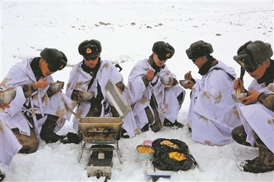 ????邊關(guān)冷,保障暖。某邊防團(tuán)四級(jí)軍士長張震說:“在零下20多攝氏度的山尖尖,面條吸溜到肚里,胃里暖暖的,身上熱熱的!”(楊仁偉、孫興維)