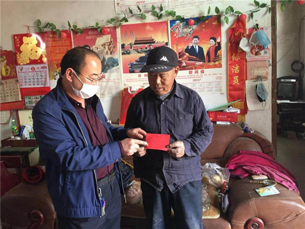 ????費(fèi)縣胡陽鎮(zhèn)退役軍人服務(wù)站站長張中方為優(yōu)撫對象送光榮單。李永臣 攝