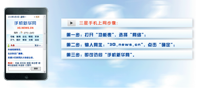 三星:依次選“上網(wǎng)鍵”-“收藏夾”-選擇一個(gè)空的收藏夾地址-確認(rèn)url地址-輸入“手機(jī)新華網(wǎng)”