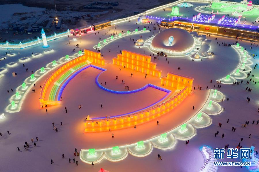 這是2021年1月1日拍攝的哈爾濱冰雪大世界園區(qū)一角(無(wú)人機(jī)照片)。