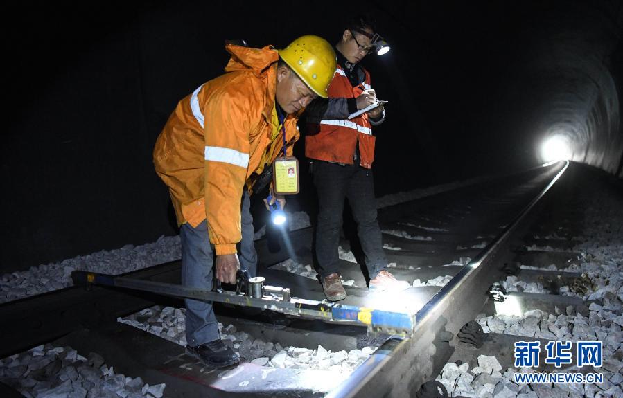 看守工廖成根(左)與工長羅昌偉檢查隧道內鋼軌幾何尺寸(1月30日攝)。