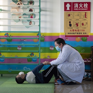 在哈爾濱博能中醫(yī)門診部,劉雨晴為腦癱兒童進(jìn)行康復(fù)訓(xùn)練(2月2日攝)。