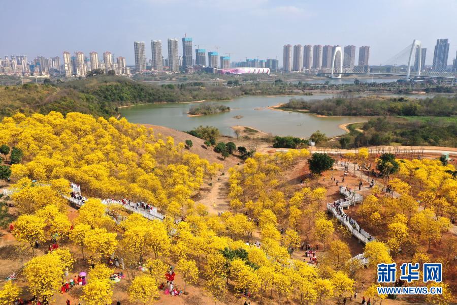 2月21日,游人在南寧市青秀山風(fēng)景區(qū)觀賞盛開(kāi)的黃花風(fēng)鈴木(無(wú)人機(jī)照片)。