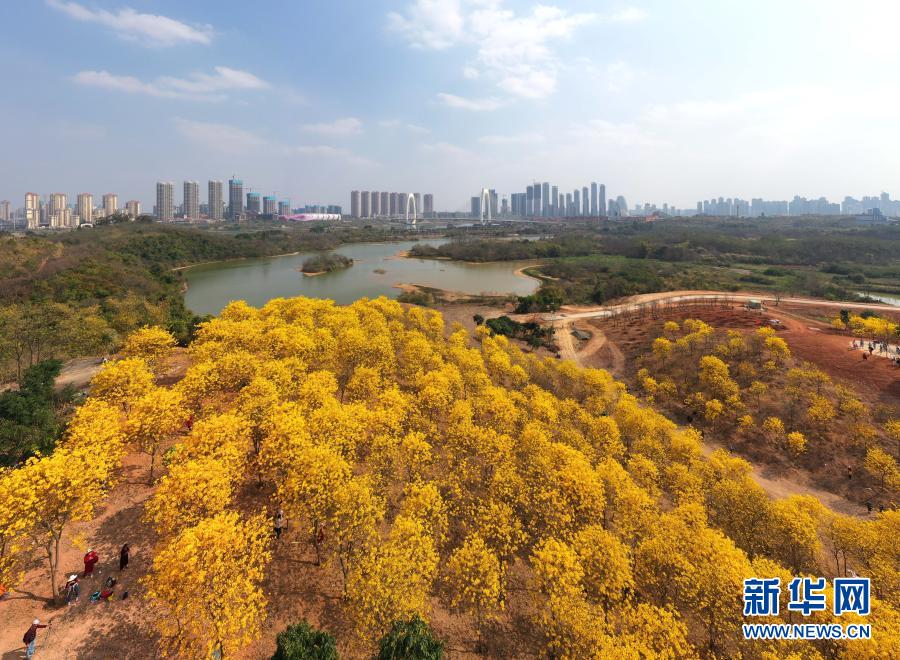近日,廣西南寧市青秀山風(fēng)景區(qū)黃花風(fēng)鈴木盛放,吸引眾多游人前來(lái)觀賞。