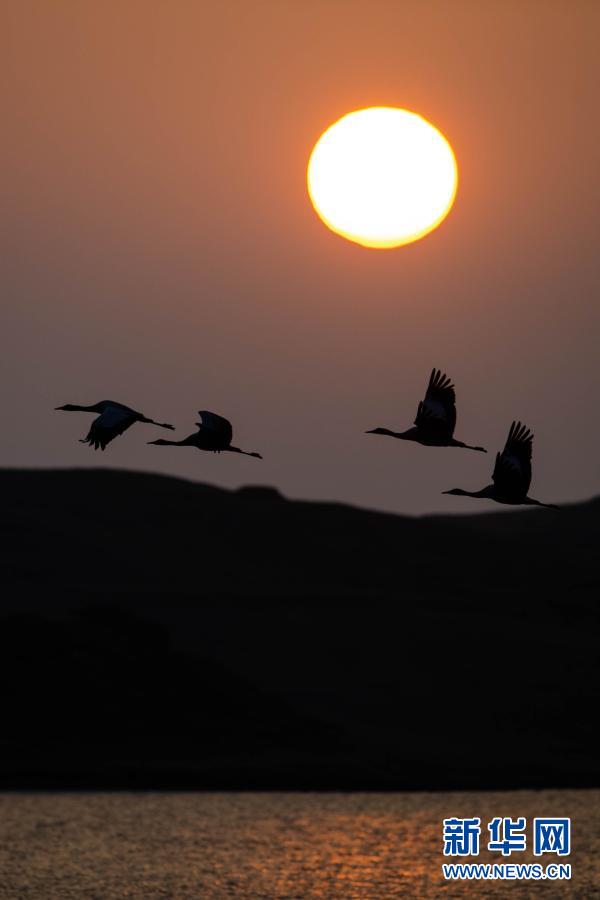 日出時分,黑頸鶴在大山包黑頸鶴國家級自然保護區(qū)飛翔(2月27日攝)。新華社記者 胡超 攝
