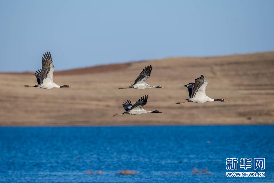 黑頸鶴在大山包黑頸鶴國家級自然保護區(qū)飛翔(2月24日攝)。新華社記者 胡超 攝