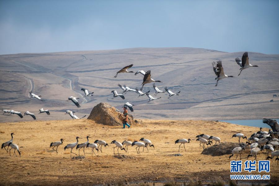 黑頸鶴在大山包大海子濕地飛翔、覓食(2月25日攝)。新華社記者 胡超 攝
