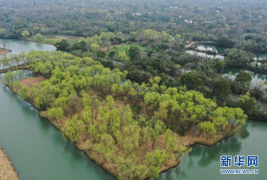 西溪濕地內(nèi)植被吐出新綠(3月2日攝,無(wú)人機(jī)照片)。