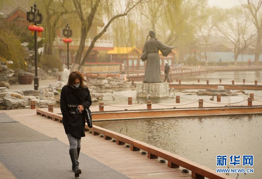 3月15日,市民經(jīng)過北京西海。當日,我國北方多地出現(xiàn)沙塵天氣。新華社記者 賈浩成 攝