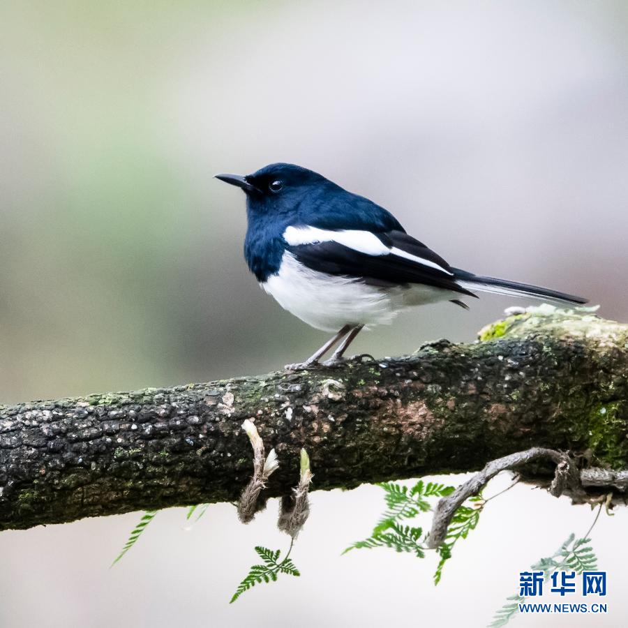 3月22日,在福州西湖公園的荷塘一角,一只鵲鴝在水邊的樹(shù)枝上停歇。
