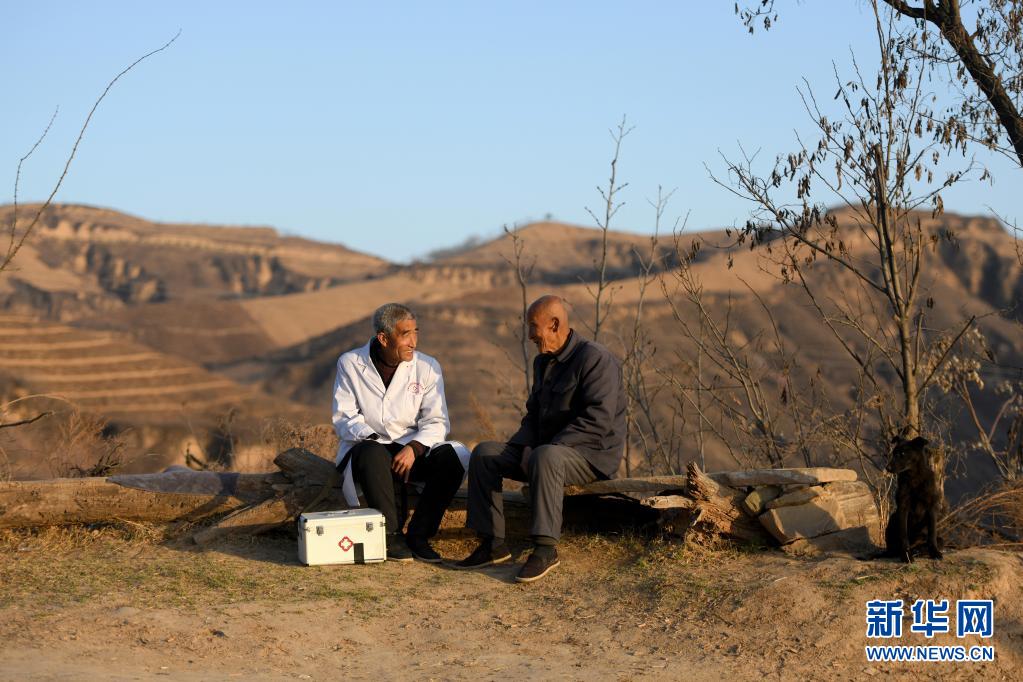 在山西省石樓縣鐵頭村張家灣自然村,張尚保(左)在詢問村民的身體情況(3月23日攝)。新華社發(fā)(劉亮亮 攝)
