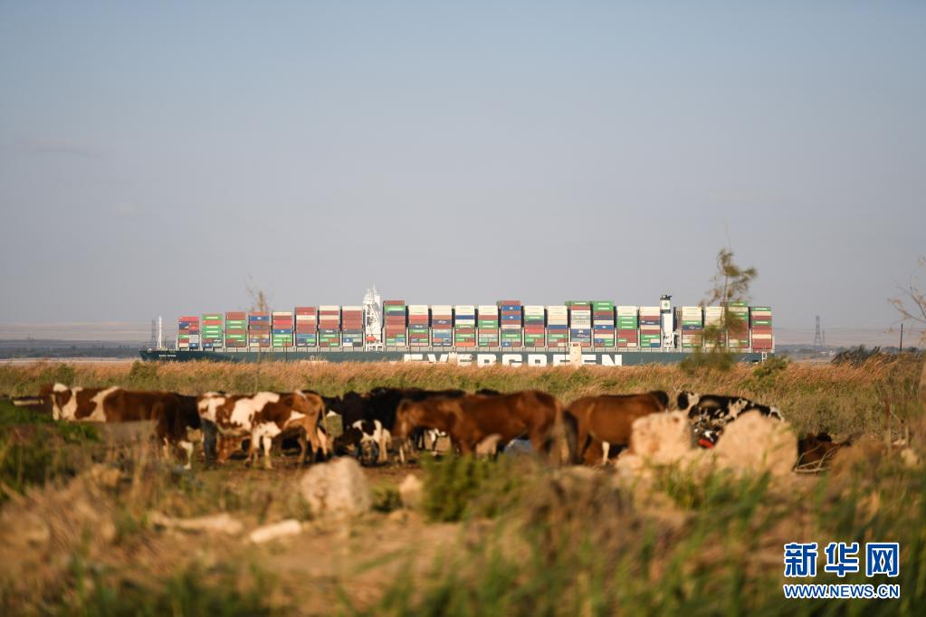 這是3月29日拍攝的移動(dòng)至埃及蘇伊士運(yùn)河正常航道上的重型貨輪。