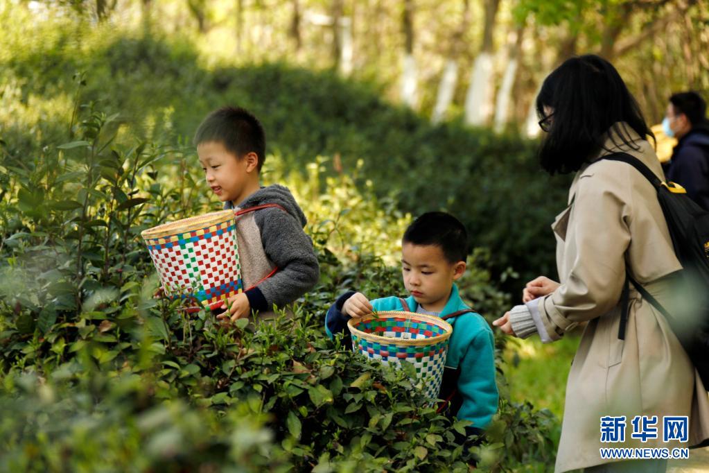 4月5日,家長(zhǎng)陪伴孩子在南京科技館茶園體驗(yàn)采茶。