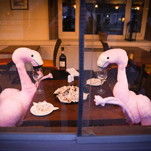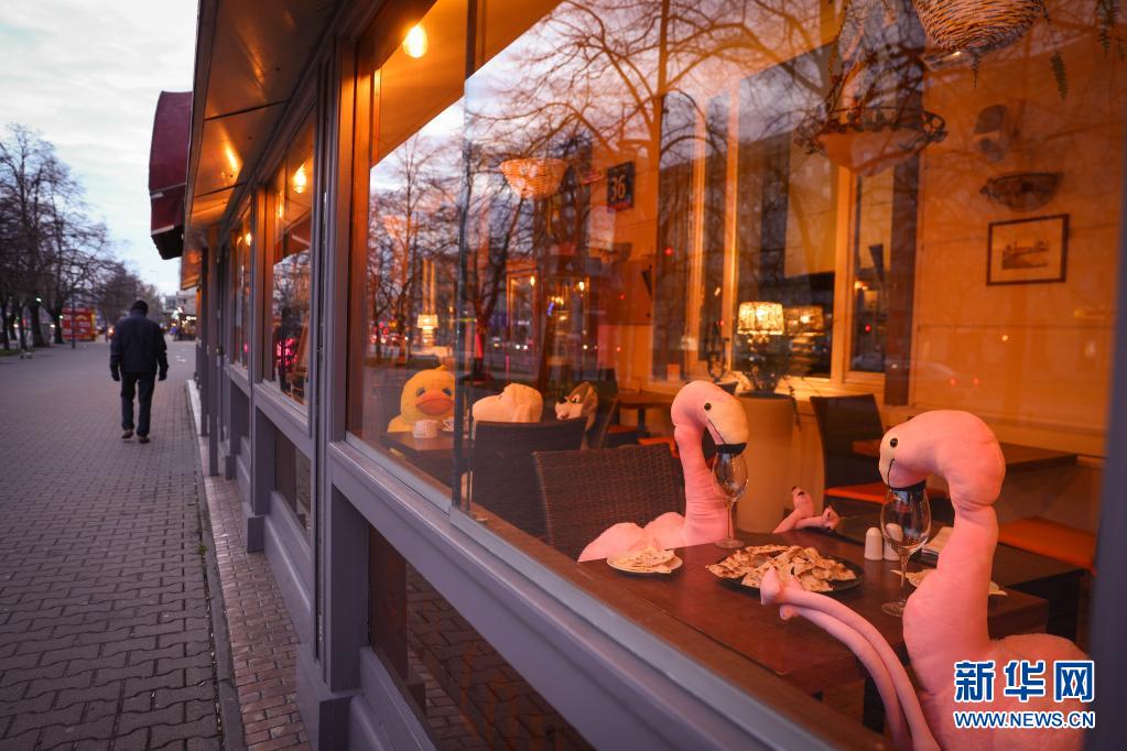 4月13日,波蘭首都華沙一家餐館將動物玩偶擺放在靠窗座位上吸引顧客。